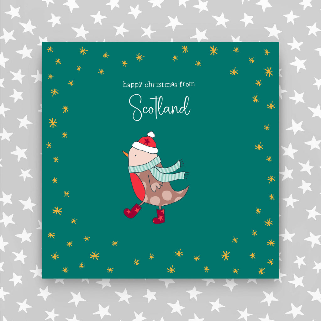 'From Scotland' - Happy Christmas - Robin. Finished with foiled snowflakes and hand-embellished with Diamontes. Supplied cello wrapped or nested with an envelope.