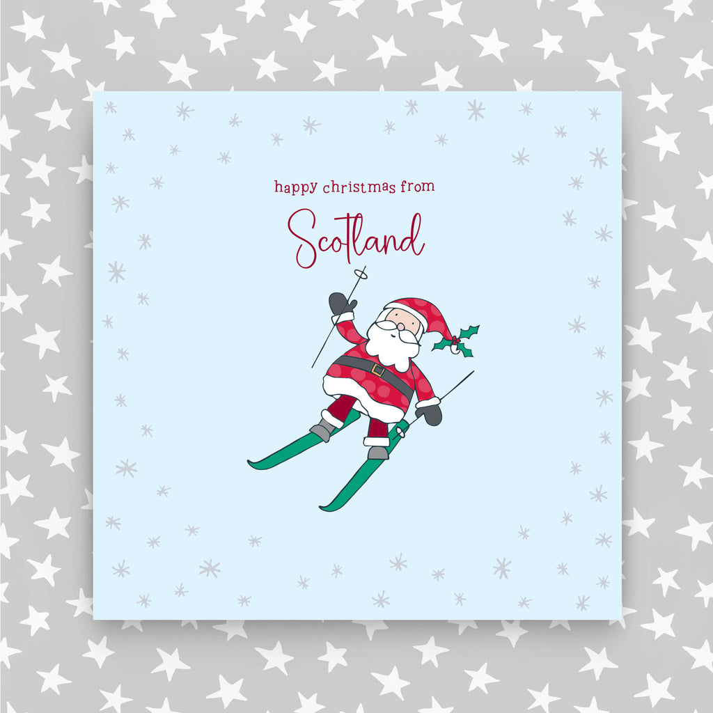 'From Scotland' - Happy Christmas - Santa skiing. Finished with foiled snowflakes and hand-embellished with Diamontes. Supplied cello wrapped or nested with an envelope.