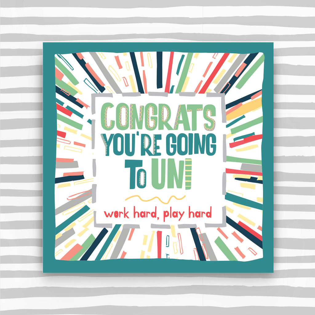 Congrats You're Going to Uni Greeting Card - work hard, play hard. Foiled and supplied cello wrapped or nested with a coloured envelope.