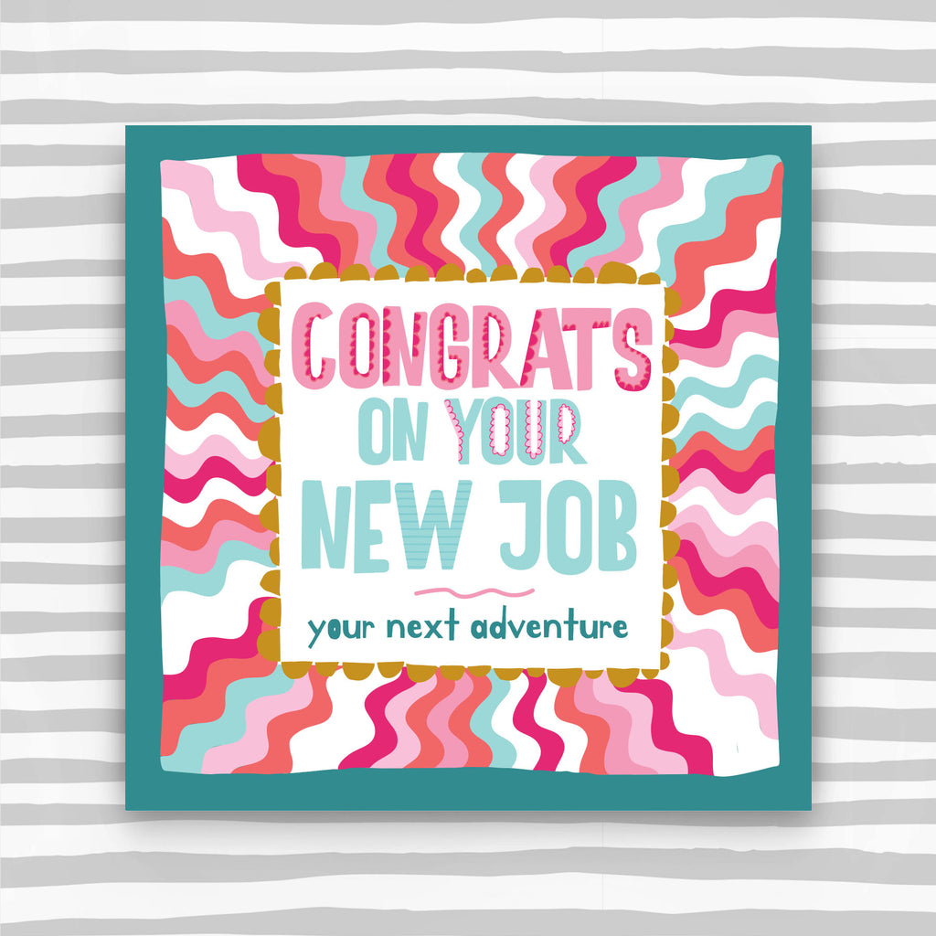 Congrats on your new job Greeting Card in pink colours. Foiled and supplied cello wrapped or nested with a coloured envelope.