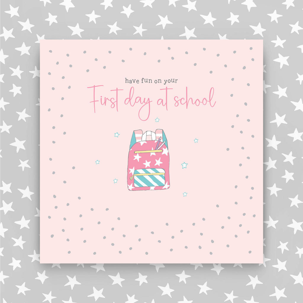 1st Day at School Greeting Card in pink colours. Finished with foiled dots and hand-embellished. Supplied cello wrapped or nested with an envelope.