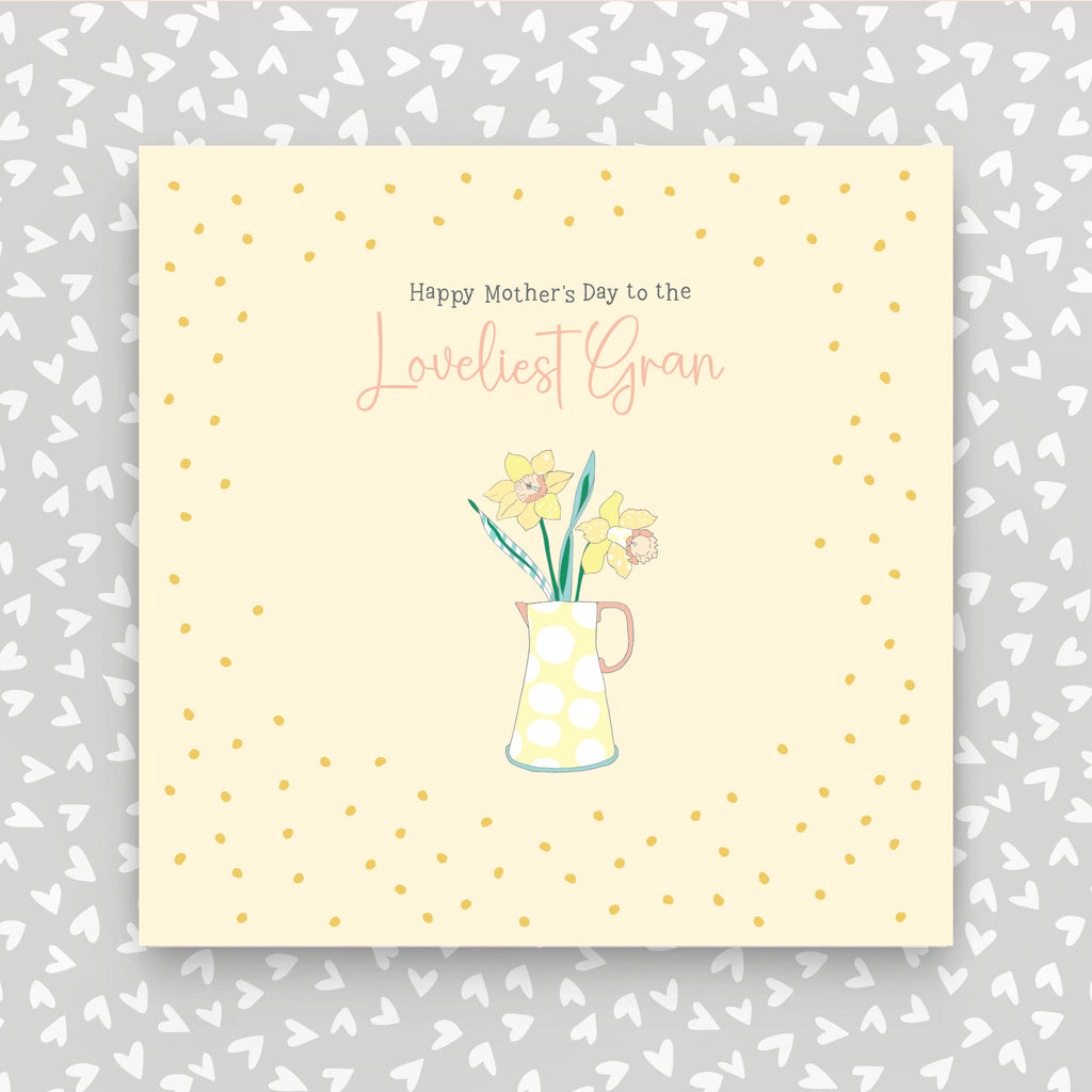 Happy Mother's Day to the Loveliest Gran. Foiled, hand finished with pearl embellishments and supplied cello wrapped or nested with a luxury envelope.